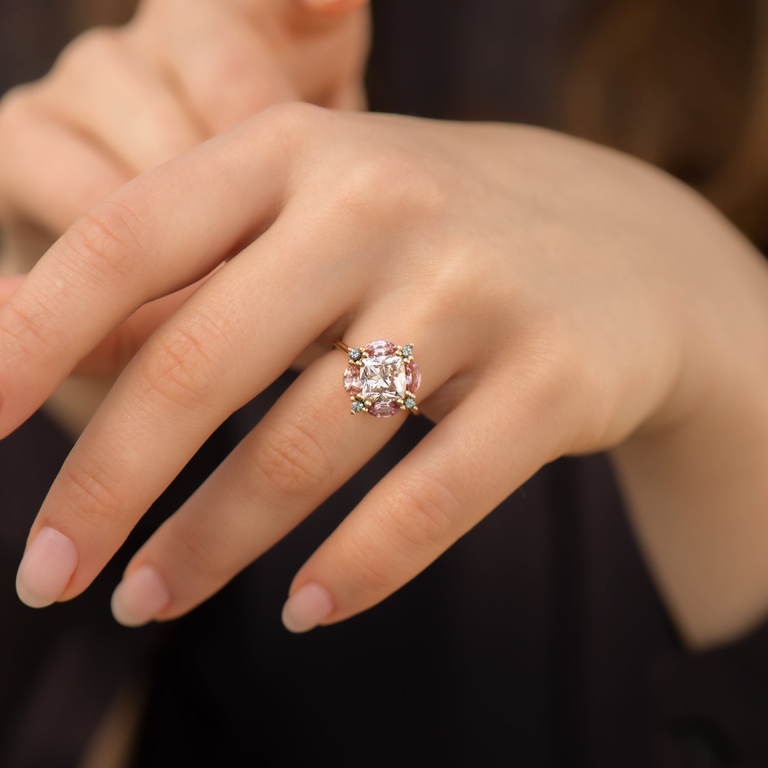 Artemer Jewelry Design, Mosaic Engagement Ring with Cushion Cut Diamond and Sapphires