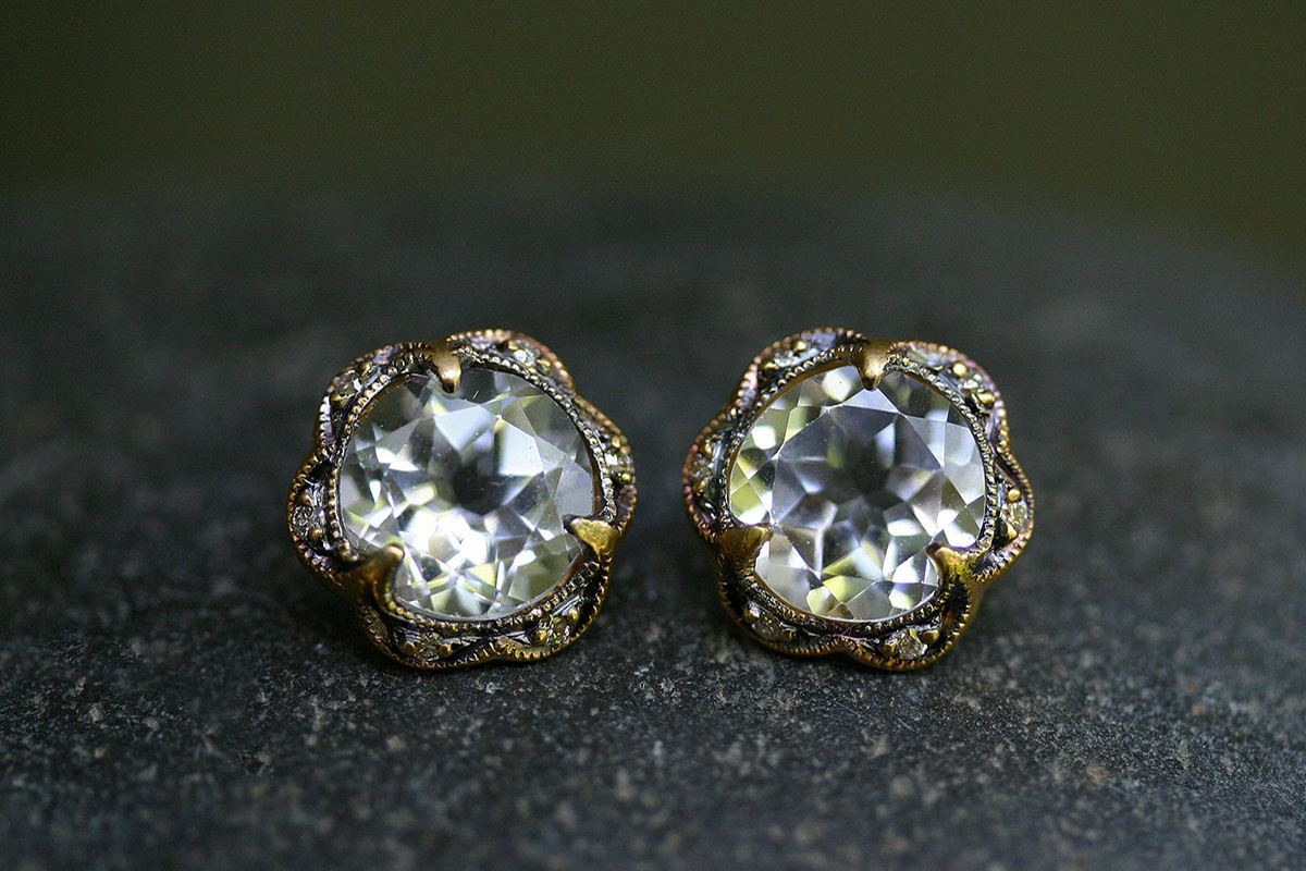 Cathy Waterman, 22K Recycled Blackened Gold Scalloped Frame Posts with Ethically Sourced White Topaz and Diamonds